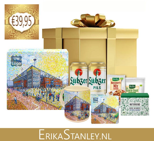 Dit NAC cadeaupakket bevat een prachtig schilderij, een mok en een grote koelkastmagneet met de afbeelding van Stadion, geschilderd Als Van Gogh.