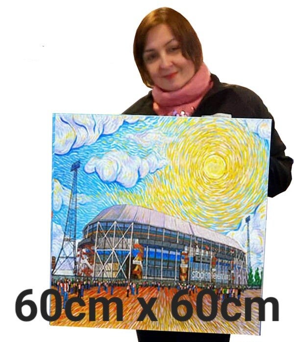 De Kuip is dé nationale voetbaltempel. Feyenoord en het Nederlands elftal behaalden grote successen in dit prachtige stadion. Geschilderd Als van Gogh is dit last minute cadeau verkrijgbaar op canvas in de maat 60 x 60 cm.
