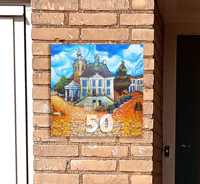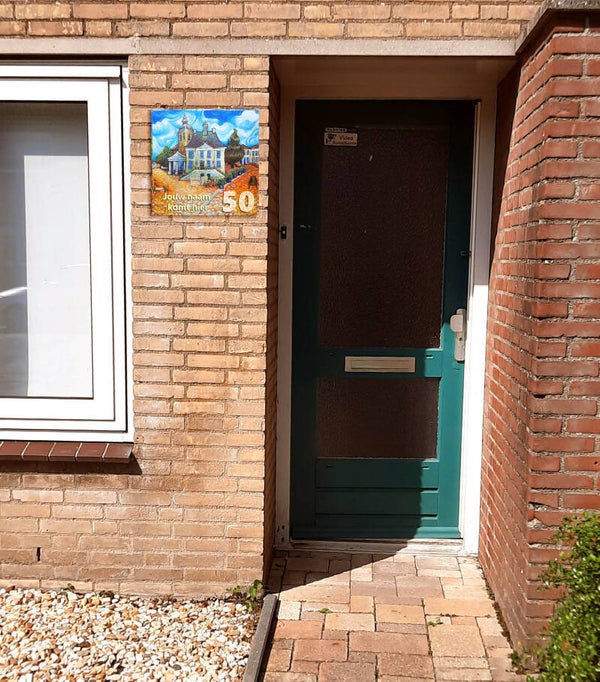 Dit huisnummerbord toont het Oude Raadhuis in Roosendaal, geschilderd Als Van Gogh. De herkenbare stijl en het warme kleurgebruik zorgen ervoor dat elk huisbezoek begint met een goed gevoel.