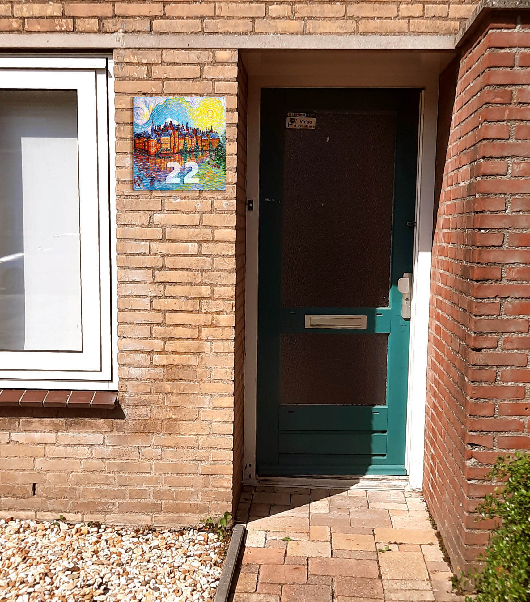 Dit huisnummerbord toont het Haagse Binnenhof, geschilderd Als Van Gogh. De herkenbare stijl en het warme kleurgebruik zorgen ervoor dat elk huisbezoek begint met een goed gevoel.