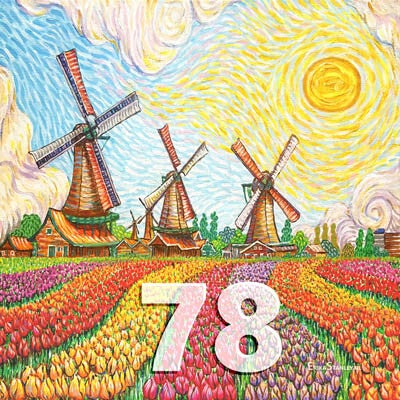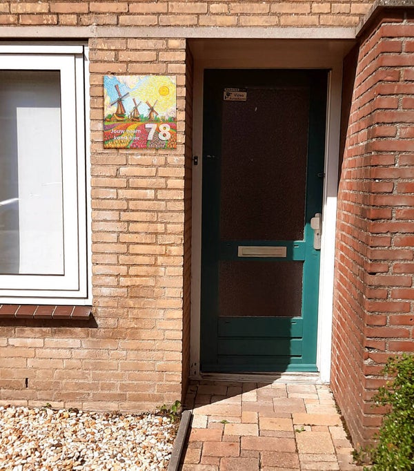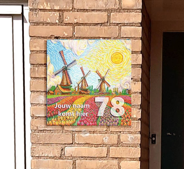 Dit huisnummerbord toont prachtige tulpenvelden, geschilderd Als Van Gogh. De herkenbare stijl en het warme kleurgebruik zorgen ervoor dat elk huisbezoek begint met een goed gevoel.