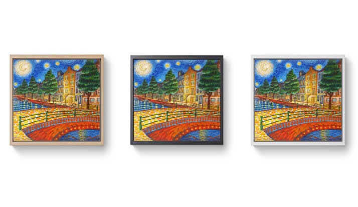 - Kies de maat van je schilderij op canvas, plexiglas of aluminium en kies de kleur van de baklijst.